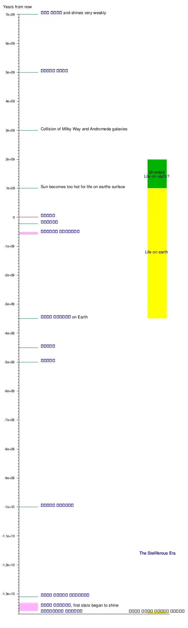 المخطط الزمني الموصوف هنا لماضي الكون ، حاضره ، ومستقبله يعتمد على أحدث المشاهدات والتفسيرات العلمية الحالية. وقد وضعنا العصر الحالي علي مقياس السنوات عند "الصفر" . وتقدر كل مرحلة من التدريج الكبير 1 مليار سنة ، وتبلغ كل فترة للتقسيم الصغير 100 مليون سنة . كما عُلّمت السنوات الماضية بعلامة "ناقص" ، والسنوات القادمة بعلامة ""زائد" . وعلى ذلك فقد تكونت أقدم الصخور على الأرض منذ نحو 4 مليار من السنين ، ويوجد هذا التاريخ عند النقطة ( 4e+09- ) سنة على محور السنين . ونظريا فقد حدث الانفجار العظيم منذ نحو 13.7 مليار سنة (أنظر أيضا الخط الزمني للانفجار العظيم).