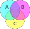 مخطط فن يبين العلاقة بين ثلاث مجموعات A و B و C.