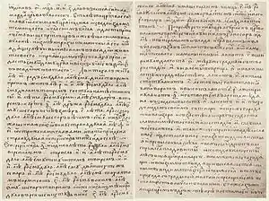 Авитохолъ житъ лет. ~т. род ему Дуло. а лет ему диломъ твирем. Ирникъ. житъ лет. ~(ри). род ему Дуло. а лет ему дилом твeримь. Гостунъ наместникь сьï два лета. род ему. Ерми. а лет ему дохсъ. втиремь. Куртъ: 60 лет дръжа. род ему Дуло. а лет ему шегоръ вечемь. Безмеръ ~г. лет. а род ему Дуло. а лет ему шегоръ вемь. сii ~е князь. дръжаше княженїе обону страну Дуная. летъ. ~ф. ~(еi). остриженами главами. И потом прiиде на страну Дунаа. Исперих княз тожде и доселе. Есперих княз. 61 лет. род Дуло. а лет ему верени алем. Тервель. -к~а. лето. род ему Дуло. а лет ему текучитем. твирем. ~(ки). лет. род ему Дуло. а род ему дваншехтем. Севаръ. ~(еl). лет. род ему Дуло. а лет ему тохалтом. Кормисошь. ~(зi). лет. род ему Вокиль. а лет ему шегоръ твиремь. Сiи же княз измени род Дулов. рекше Вихтунь. Винех. ~з. лет. а род ему Оукиль. а летъ ему имаше Горалемь. Телець. ~г. лета. род Оугаинь. а лет ему соморъ. алтемь. И сïй иного рад. Оуморъ. ~м. днïи. род ему Оукиль а ему дилом тоутомъ.