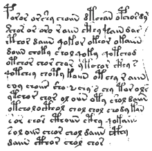 والنص يبدو أكثر تكراراً من النصوص الأوروبية المثالية؛ هناك بعض الحالات التي تظهر فيها الكلمة ثلاث مرات متتابعة. الكلمات التي تختلف فقط بواسطة حرف واحدة تكرر أيضاً بتردد غير عادي.