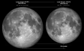مدار القمر حول الأرض هو بيضاوي الشكل (elliptical) بانحراف مداري (eccentricity) قدره 0.0549 كما في الصورة السفلى (نقطتي الأوج والحضيض: perigee and apogee).