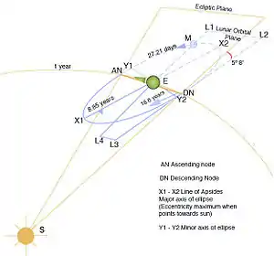 الصورة المقابلة تبين المدة التي يدور فيها القمر، حيث أن مستوى مدار القمر منحنِِ بمقدار 5.2° عن مستوى مدار الأرض وتتذبذب هذه القمية بمقدار ±0,15° في كل 173 يوما.