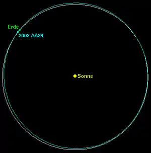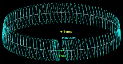 1) كويكب 2002 إيه إيه 29 الذي يتوافق مداره مع مدار الأرض حول الشمس ، ويبلغ دورته حول الشمس سنة فلكية. يبدو مداره من الأرض في هيئة حدوة حصان .