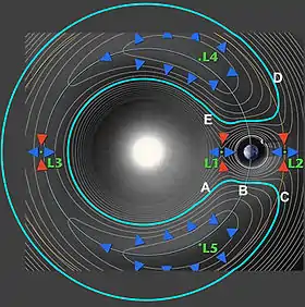 وعندما يكون الكويكب قريبا من الأرض عند النقطة A - وهو الآن يكون خلفها ويلاحقها - فيتأثر الكويكب أيضا بجاذبية الأرض مما يزيد من سرعته على مداره . وبسبب زيادة قوة الطرد المركزية له (بسبب زيادة سرعته في مداره) فإنه ينزاح إلى الخارج وتزيد المسافة بينه وبين الشمس فتقل سرعته عن سرعة الأرض في مدارها (ابتداء من النقطة B ) ولا يستطيع ملاحقتها ثم يدخل مداره ليصبح داخل مدار الأرض ثانيا .