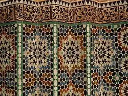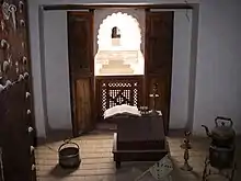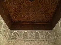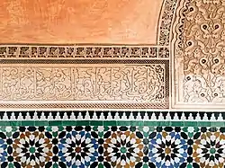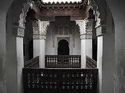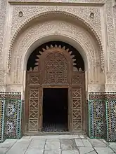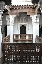مدخل للصحن المركزي المزخرف بخشب الأرز المنقوش والجبس المعقد والزليج