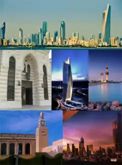 ![]() من أعلى إلى أسفل من اليمين : مدينة الكويت من الخليج ، أبراج الكويت , برج الحمراء ، مسجد الصالحية ، مدينة الكويت ، قصر السيف . | |