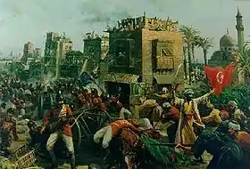 ![]() جنود محمد علي باشا وقد أحاطوا بالمماليك من كل جانب وأمطروهم بوابل من الرصاص. بريشة إميل جان هوراس فيرنيه. | |