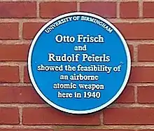 جامعة برمنغهام - مبنى فيزياء بوينتينج - لوحة زرقاء تحمل أسماء الفيزيائيين فريش وبييرلس
