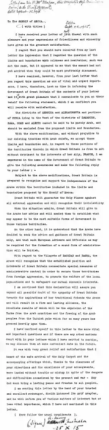 "مقاطعتا مرسين واسكندرونة وأجزاء من سوريا واقعة غرب مقاطعات دمشق وحمص وحماة وحلب كلها مناطق لايمكن القول إنها عربية تماماً، ولذا يجب استثناؤها من الحدود المقترحة. مع التعديلات في الأعلى وبغض النظر عن معاهدتنا الحالية التي توصّلنا إليها مع القادة العرب، فقد قبلنا هذه الحدود. بخصوص الأراضي التي يحق لبريطانيا العظمى التصرف [المفاوضة] فيها بدون إضرارٍ بمصالح حليفتها فرنسا، وباسم حكومة بريطانيا العظمى أطمئنكم وأقدم لكم هذا الرد: بخصوص التعديلات في الأعلى، فإن بريطانيا العظمى مستعدة للاعتراف باستقلال العرب داخل الأراضي والحدود التي اقترحها شريف مكة."[51]