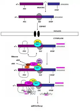 حين يصل الريبوسوم إلى كودن التوقف المبتسر، تتآثر عوامل الترجمة eRF1 وeRF3 مع مركبات موصل الإكسون غير المزالة عبر جسر عديد البروتين.[22] تآثرات UPF1 مع مركب الإنهاء ومع بروتيني UPF2/UPF3 الخاصين بمركبات موصل الإكسون غير المزالة حاسمةٌ وتؤدي إلى وسم الرنا الرسول للتفكيك السريع بواسطة النوكليازات داخلية المنشأ.[19][22]