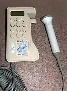 تم اختراع الجهاز في عام 1958 بواسطة الدكتور إدوارد ه. هون،[1] شاشات دوبلر الجنينية أو أجهزة مراقبة نبض الطفل هي جهاز محول باليد بالموجات فوق الصوتية يستخدم للكشف عن نبضات قلب الجنين للرعاية السابقة للولادة. ويستخدم تأثير دوبلر لتوفير محاكاة مسموعة من ضربات القلب. بعض النماذج أيضا عرض معدل ضربات القلب في نبضة في الدقيقة (بم). استخدام هذه الشاشة يعرف أحيانا باسم تسمع دوبلر. عادة ما يشار إلى مراقبين الجنين دوبلر ببساطة باسم "دوبلرز" أو "دوبلرز الجنين".