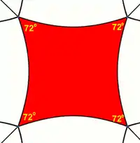 ![]() Squares can tile the hyperbolic plane with 5 around each vertex, with each square having 72-degree internal angles. The رمز شليفلي هو {4,5}. |
