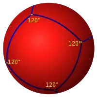 ![]() ست مربعات يمكن أن تقسم كرة إلى ست أقسام بثلاث مربعات حول كل رأس وزاوية بقياس 120 درجة 3 . رمز شليفلي هو l {4,3}. |