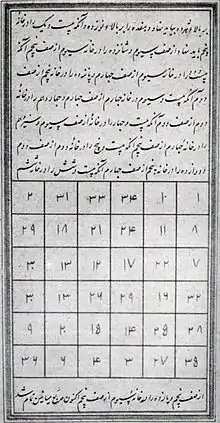 في الرياضيات المسلية، المربع السحري هي مصفوفة مربعة ذات حيز ، مكونة من أعداد صحيحة، بحيث أن حاصل جمع رقم في كلّ من الصفوف والأعمدة والأقطار الرئيسية يأدي لنفس الحاصل.[1] توجد مربعات سحرية مهما كان الحيز ، بإقصاء (أربع أعداد)، مع كون الحالة تعتبر أمرا بديهيا. يبين الشكل التالي مثالا لمربع سحري من