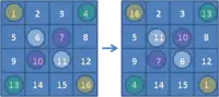 - 2- التبديل بين جميع أركان المربع. مثلا في المربع 4×4 تكون أركانه هي 1، 4، 13، 16. عند التبديل بين الركن الأول والرابع أي 1، 16 والركن الثاني والثالث أي 4، 13.