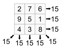 لاحظ أن مجموع كل سطر وعمود وقطر رئيسي يساوي دائما 15. يسمى هذا المجموع ثابتا سحريا وقيمته بصفة عامة: