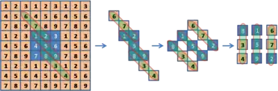- 4- يتم نقل العناصر الجديدة إلى مصفوفة جديدة مع تدويرها 45 درجة بحيث تصبح الصفوف والأعمدة الأصلية أقطارا والأقطار الأصلية صفوفا.