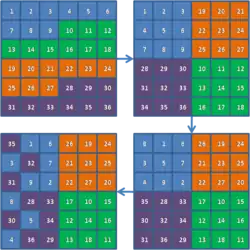 - 4- نقل نسخة من هذا المربع في المربعات الثلاثة الباقية مع إضافة n2/4 لكل عنصر في المربع الثاني، n2/2 لكل عنصر في المربع الثالث، و3n2/4 لكل عنصر في المربع الرابع.