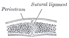 ![]() ارتباط عظم الجمجمة عن طريق الأربطة (مفصل)، والكل يغطيه السمحاق. ارتباط عظم الجمجمة عن طريق الأربطة (مفصل)، والكل يغطيه السمحاق. | |