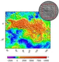 ويبدو على السطح التواءات وتكسرات مما يرجح نظرية قوى الضغط الكبير المؤدية لتشكله. كما يوجد مقدار كبير من تدفقات الصهارة. وتوجد العديد من القنوات تعبر هذه المرتفعات.
