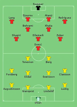 |CitationClass=تم تجاهله (مساعدة) - "Tactical Line-up – Round of 16 – Sweden v Switzerland" (PDF). FIFA.com. Fédération Internationale de Football Association. 3 July 2018. مؤرشف من الأصل (PDF) في 10 سبتمبر 2018. اطلع عليه بتاريخ 03 يوليو 2018. الوسيط
