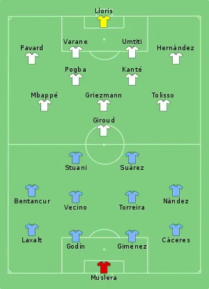 |CitationClass=تم تجاهله (مساعدة) - "Tactical Line-up – Quarter-final – Uruguay v France" (PDF). FIFA.com. Fédération Internationale de Football Association. 6 July 2018. مؤرشف من الأصل (PDF) في 10 سبتمبر 2018. اطلع عليه بتاريخ 06 يوليو 2018. الوسيط