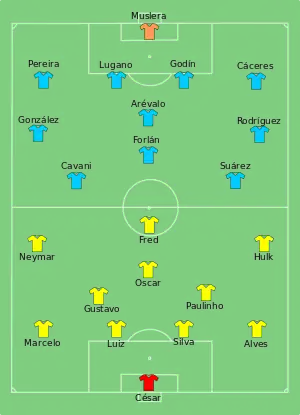 |CitationClass=تم تجاهله (مساعدة) - "Tactical Line-up – Semifinals – Brazil-Uruguay" (PDF). FIFA.com. Fédération Internationale de Football Association. 2´6 June 2013. مؤرشف من الأصل (PDF) في 3 مارس 2016. اطلع عليه بتاريخ 26 يونيو 2013. الوسيط