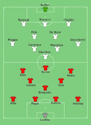 |CitationClass=تم تجاهله (مساعدة) - "Tactical Line-up – Semifinals – Spain-Italy" (PDF). FIFA.com. Fédération Internationale de Football Association. 27 June 2013. مؤرشف من الأصل (PDF) في 3 مارس 2016. اطلع عليه بتاريخ 27 يونيو 2013. الوسيط
