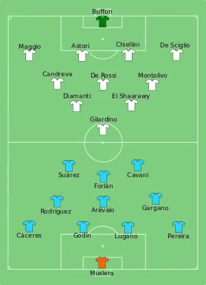 |CitationClass=تم تجاهله (مساعدة) - "Tactical Line-up – Third place match – Uruguay-Italy" (PDF). FIFA.com. Fédération Internationale de Football Association. 30 June 2013. مؤرشف من الأصل (PDF) في 3 مارس 2016. اطلع عليه بتاريخ 30 يونيو 2013. الوسيط