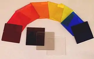 المرشح الضوئي يسمح بمرور الضوء الذي له طول موجة معينة ، مثل الأحمر أو الأخضر ويحجز ألوان الأخرى ز وتستخدم في التصوير وفي بعض الأجهزة الضوئية وللإضاءة.
