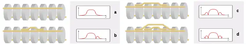 تُعد أسلاك التوصيل القنطرية قضبانًا تصل ما بين الرنانات غير المتجاورة. ويمكن استخدامها في إنتاج أقطاب توهين في النطاق المانع. ويمثل ذلك فائدة في زيادة رفض النطاق المانع. عندما يوضع القطب بجوار حافة نطاق التمرير تحدث استفادة أيضًا من زيادة اللف للخارج وتقليل نطاق التحويل. يوضح الشكل 11 التأثيرات النموذجية لبعض هذه الأسلاك على استجابة التردد للمُرشِّح. ويمكن للتوصيل القنطري عبر رنان مفرد إنتاج قطب من التوهين في النطاق المانع العالي (الشكل 11ب). أما التوصيل القنطري عبر رنانين يمكنه أن ينتج قطبًا من التوهين في كلٍ من النطاق المانع العالي والمنخفض (الشكل 11ج). وكذلك سيؤدي استخدام توصيلاتٍ قنطرية متعددة إلى أقطابٍ متعددة من التوهين (الشكل 11د). وبهذه الطريقة، يمكن لتوهين النطاقات المانعة أن تتعمق على نطاق تردد واسع.[44]