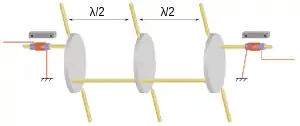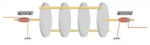 ويعرض الشكل 10أ مثالاً على هذا التصميم. تُعد الرنانات من نوع الثني القرصية مشابهة للرنانات المعروضة في الشكل 6، عدا أن هذا النوع من الرنانات يتم تحفيزه من حافة، تؤدي إلى اهتزاز في وسيط الثني الأساسي ذي الأنبوب في المركز، بينما التصميم الموضح في الشكل 6 يتم تحفيزه من المركز ثم يؤدي ذلك إلى اهتزاز في وسيط الثني الثاني بدائرة الرنين. وتُرفق الرنانات ميكانيكيًا بالغطاء عن طريق محاور ارتكاز في زوايا يمينية إلى أسلاك التوصيل. وتضمن محاور الارتكاز دورانًا حرًا للرنان وتقلل الخسائر إلى أدنى حدٍ ممكن. يتم التعامل مع الرنانات على أنها عناصر تجمعية، ومع ذلك تُصنع أسلاك التوصيل من طول نصف موجة (λ/2) بالضبط ويتعادلون مع طول دائرة مفتوحة λ/2 في الدائرة المعادلة الكهربائية. أما بالنسبة إلى مُرشِّح نطاق ضيق، فإن لطول من هذا النوع دائرة معادلة تقريبية لدائرة تحويلية مضبوطة ومتوازية في الشكل 10ب. وبالتالي، فإن الهدف من وراء استخدام أسلاك التوصيل في هذا التصميم هو إضافة رناناتٍ أخرى بداخل الدائرة للحصول على استجابة أفضل من واحدة بها رنانات تجمعية وتوصيلات قصيرة.[43] وبالنسبة للترددات الأعلى يمكن استخدام طرق كهروميكانيكية صغيرة كما سيتضح فيما يلي.