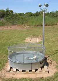 تستخدم أحواض التبخر لحصر المياه أثناء المراقبة لتحديد كمية التبخر في منطقة معينة. تتنوع أشكال أحواض التبخر وقياساتها، لكن أكثر الأشكال شيوعاً هي الأحواض التي تكون على شكل دائري أو مربع. أكثر الأنواع شيوعاً هي الأحواض من النوع أ وأحواض كولارادو المدفونة. كما يعرف في الهند وأوروبا وجنوب أفريقيا حوض سيمون. يتم التحكم بمستوى المياه عن طريق حساس لاستشعار مستوى المياه، كما توضع بالقرب منه محطة رصد جوي صغيرة. الطرق المعيارية تنتشر أحواض مختلفة في الشكل حول العالم، لذلك تستخدم صيغ للتحويل من نوع إلى آخر والتدابير البيئية اللازمة.[5] كما أجريت العديد من البحوث حول الإجراءات المثلى لتركيب أحواض التبخر من أجل الحصول على تكرار قياسات ذات موثوقية عالية.[6] أحواض التبخر من النوع أ تعتبر الهيئة الوطنية للرصد الجوي في الولايات المتحدة الأمريكية أحواض التبخر من النوع أ هو وسيلة القياس المعيارية لأحواض التبخر. وهذا الحوض المعياري عبارة عن أسطوانة بقطر 47.5 إنش (120.4 سم) بعمق 10إنش (25 سم)، ويرتكز على قاعدة خشبية. كما يحاط بسور من السلاسل لمنع الحيوانات من الشرب منه. وتقاس نسبة التبخر فيه بشكل يومي بمعرفة كمية المياه المتبخرة في ارتفاع واحد بوصة. يبدأ القياس اليومي بملأ إنشين من أعلى الحوض، وفي نهاية اليوم بعد مضي 24 ساعة تحسب كمية المياه اللازمة للمحافظة على مستوي الإنشين. في حالة هطول الأمطار خلال فترة ال 24 ساعة تؤخذ بعين الاعتبار كميات الأمطار في حساب التبخر. أما إذا كانت كميات هطول الأمطار أكبر من معدل التبخر فيجب إخراج الزيادة في كمية الأمطار من خلال منحدر مثبت في الحوض. أما من مساوء هذا النوع من أحواض التبخر بأنه لايمكن قياس معدل التبخر في حالة تجمد مياه الحوض .أحواض كولارادو المدفونة وهي عبارة عن حوض بشكل مربع طول ضلعه 1 متر وعمقه 0.5 متر وكما يوحى من اسمه فإنه يدفن في الرمال حتى 5 سم من حافته. يمكن أجراء مقارنة بين هذا النوع من أحواض التبخر والنوع أ من خلال معامل تصحيح، والذي يساوي 0.8 كمعامل سنوي..[7] الميل العالمي لانخفاض نسبة التبخر لاحظ العلماء سنة 199s العلماء شيء اعتبر ذلك الوقت غريب جداً وهو النقص في معدل التبخر .[8] وقد لوحظ هذا الاتجاه في جميع أنحاء العالم إلا في أماكن قليلة حيث زاد .[9] [10] [11] [12] كان من المتوقع أنه مع ارتفاع درجة حرارة المناخ العالمي (الاحترار العالمي) فإنه يجب أن يترافق مع زيادة التبخر كنتيجة لتسارع الدورة الهيدرولوجية.[13] دعي الارتباط افي لاتجاه العام لتناقص التبخر بظاهرة التعتيم العالمي.[14] [15] إلا أن وجد ويلد وآخرون سنة 2005 أن الاتجاه العالمي للتعتيم قد انعكس منذ سنة 1990[16] تبخر البحيرات وأحواض التبخر استخدمت أحواض التبخر لتقدير معدل التبخر من البحيرات.[17]. ويوجد معامل تصحيح بين التبخر في أحواض التبخر وبينه في البحيرات. حيث أن التبخر في الأماكن الطبيعية هو أقل منه في الأحواض فهي غير محاطة بجدار معدني والذي يعتبر ناقل جيد للحرارة.[18]. تفرض معظم المراجع أن معامل التصحيح هو 0.75 الذي يجب أن يضرب بالنتائج المستقاة من أحواض التبخر لنحصل على قيمته في البحيرات. العلاقة مع دورة الماء "من المتفق عليه أن التبخر في الأحواض تناقص خلال نصف القرن الماضي في مناطق كثيرة من الأرض، إلا أن أهمية هذا الاتجاه السلبي فيما يتعلق بالتبخر لا يزال مثاراً للجدل إلى حد ما، والآثار على دورة المياه على الصعيد العالمي لا تزال غير واضحة. ينبع الخلاف فيما إذا كان هذا التناقص ناتج بسبب ظاهرة التعتيم العالمي أو بالعلاقة بين احواض التبخر والتبخر الأرضي.[19]