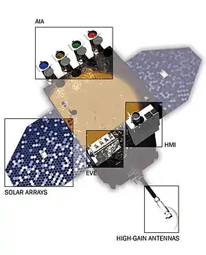(HMI) : صُمم هذا الجهاز في جامعة ستانفورد، وهو يسمح بقياس التغيرات الشمسية وبعد ظواهر النشاط المغناطيسي للشمس. - جهاز التصوير الغلاف الجوي للشمس AIA : هذه مجموعة أجهزة تصوير، صُممت في شركة لوكهيد مارتن . سوف تقوم بتصوير الشمس بأكملها عند أطوال موجة مختلفة للموجات الكهرومغناطيسية في حيز الأشعة فوق البنفسجية وفي نطاق الترددات العالية للأشعة فوق البنفسجية وذلك بدرجة تباين عالية من الوجهتين الزمنية والمكانية .
