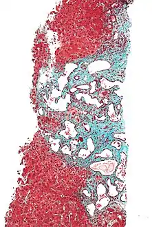 ![]() صورة ميكروسكوبية تظهر مركب فون ميينبورج، ورم عامي في قناة الصفراء مصاحبة لتكيسات الكبد. صبغة ثلاثية الألوان. صورة ميكروسكوبية تظهر مركب فون ميينبورج، ورم عامي في قناة الصفراء مصاحبة لتكيسات الكبد. صبغة ثلاثية الألوان. | |