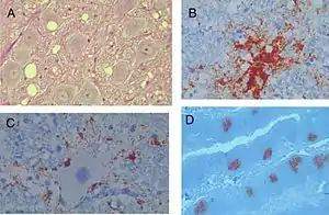 في الفحص المجهري، تشبه آفات المرض في الجهاز العصبي المركزي تلك الخاصة بالاعتلاات الدماغية الإسفنجية المعدية الأخرى. بالإضافة إلى ذلك، يستخدم العلماء كيمياء الأنسجة المناعية لاختبار وجود بروتين البريون الشاذ الغير الطبيعي في أنسجة الدماغ واللمف ونسيج الغدد الصم العصبية بغية تشخيص المرض. وتعتبر نتائج كيمياء الأنسجة المناعية (IHC) الإيجابية في مزلاج الدماغي المعيار الذهبي.[9]