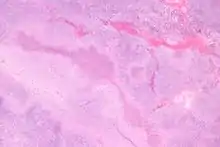 يتميز مرض خدش القطة بالتهاب حبيبي عند الفحص النسيجي للغدد الليمفاوية. تحت المجهر، تُظهر الآفة الجلدية تركيزًا محدودًا للنخر، محاطًا بخلايا نسيجية، غالبًا ما تكون مصحوبة بخلايا عملاقة متعددة الأنوية، وخلايا ليمفاوية، وحمضات. تظهر الغدد الليمفاوية الإقليمية فرط تنسج جرابي مع النخر النجمي المركزي مع العدلات ، محاطة بخلايا المنسجات (أورام حبيبية قيحية) والجيوب المعبأة مع الخلايا البائية أحادية الخلية، عادة بدون خلايا حول حويصلية وداخل حويصلية. هذا النمط، على الرغم من أنه نموذجي، موجود فقط في أقلية من الحالات. [19]