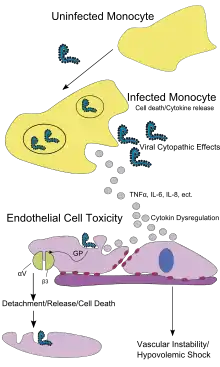 خلايا البطانة الغشائية قد تكون مصابة خلال 3 أيام بعد التعرض للفيروس.[23] ويمكن أن يعزى انهيار الخلايا البطانية التي تؤدي إلى إصابة الأوعية الدموية بالتهتك وبما يطلق عليه فيروس إيبولا البروتين سكري . هذا الضرر يحدث نتيجة لتخليق بروتين سكري فيروس إيبولا (GP)، مما يقلل من توافر مادة الإنتغرين المسؤولة عن التصاق الخلية إلى هياكل بين الخلايا ويسبب تلف الكبد، مما يؤدي إلى تخثر معيب. النزف على نطاق واسع الذي يحدث في الناس المتضررين يسبب تورم وصدمة بسبب فقدان حجم الدم. في اختلال وظيفي في النزيف والتخثر ويعزى بشكل شائع في مرض فيروس إيبولا نظرا إلى زيادة تفعيل مسار خارجي من شلال التخثر بسبب الإنتاج المفرط العامل النسيجي بنسبة خلية وحيدة خلية ضامة أكولة كبيرة.[7]