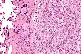 ![]() صورة مجهرية للورم الوعائي المَشيمي. (صبغة الهيماتوكسيلين والإيوسين) | |