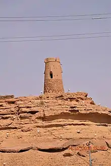 - مبنى المرقب مغطى بطبقة من لياسة خارجية من الطين والحجر