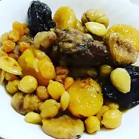 | المكونات الرئيسية | لحم الخروف، المشمش، البرقوق، الزبيب، البندق(بوفريوة)، اللوز |