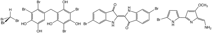 الاشكال البنائية لبعض المركبات العضوبرومينية المتواجدة في الطبيعة. من اليسار: ثلاثي برومو الميثان, ثنائي فينول مبروم, ثنائي برومو إنديجو(الأرجوان الصور),و the antifeedant tambjamine B.
