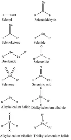 تكون حالة الأكسدة +2 هي السائدة في مركبات السيلينيوم العضوية. تضعف الرابطة بين الكربون وعناصر المجموعة السادسة عشر هبوطاً في المجموعة من الأعلى والأسفل، لذلك فالرابطة بين السيلينيوم والكربون (234 كيلوجول/مول) أضعف مثلاً من الرابطة بين الكربون والكبريت (272 كيلوجول/مول)؛ وهذا ما يترجم بمعيار طول الرابطة، فالرابطة C−Se طولها 198 بيكومتر، في حين أن الرابطة C−S طولها 181 بيكومتر. يعد مركب سيلينيد ثنائي الإيثيل أول مركبات السيلينيوم العضوية المكتشفة، وذلك سنة 1836.[6]
