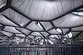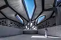 تقع قاعة الصلاة في مسبح منعكس ويمكن الوصول إليها من الجسور الزجاجية العالية المؤدية إلى مداخله. يمثل هذا الموكب الانتقال من ترك العالم المدان للدخول إلى العالم المقدس. يضيء المسبح العاكس ليلاً مما يعطي الوهم بأن المبنى بأكمله يطفو فوق الماء. إلى أي جانب من قاعة الصلاة، تقوّس وظائف دعم جدران الحوائط، بما في ذلك مساحات الوضوء ومكتب الإمام. صُممت قاعة الصلاة الرئيسية على شكل مكعب مساحته 75 قدم مربع مغلف ببشرة دينامية ذات طبقات. يتم فصل الطبقة الخارجية من الزجاج عن طبقة داخلية من الخرسانة المكسوة بالحجارة بثلاثة أقدام. تم تصميم المئذنة التي يبلغ طولها 115 قدما لتكمل المسجد في أنماط مماثلة من الكسوة الحجرية والنوافذ. تستوعب قاعة الصلاة الرئيسية 200 رجل، في حين أن طابق الميزانين يستوعب 100 امرأة.[15]