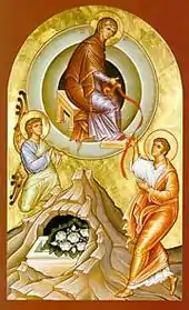 بحسب إنجيل لوقا فإنه عندما كانت أليصابات في الشهر السادس من حملها بيوحنا المعمدان،[24] ظهر ملاك الرب جبرائيل: إلى عذراء مخطوبة لرجل اسمه يوسف من بيت داود، واسم العذراء مريم، فدخل الملاك وقال لها: سلام لك يا مريم، أيتها المنعم عليها، الرب معك، مباركة أنت بين النساء.[لوقا 27/1]