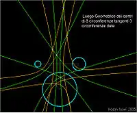 فإذا إفترضنا وجود ثلاث دوائر مختلفة، والمطلوب رسم (بواسطة الرسم الرقمي) ثمانية دوائر تمس هذه الدوائر المعطية. فالعمل الذي اعتمد يكمن في تحديد المحل الهندسي لجميع مراكز دوائر التماس، حيث كل زوج من الدوائر المعطاة له قطعين زائدين بخاصية ذلك المحل الهندسي. وبما ان الدوائر المعطاة ثلاثة، فإن العدد الإجمالي للقطوع الزائدة يكون ستة قطوع، والنقاط المشتركة بين فروع كل ثلاثة قطع زائدة، تكون مراكز الدوائر الثماني المطلوبة.