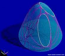 - مشكلة التماس بين ثلاثة قطوع لسطح ثنائي. في هذه الحالة تم الحصول على 4 أزواج من المخروطيات المتماسة لتلك القطوع (انظر الصورة المرفقة.