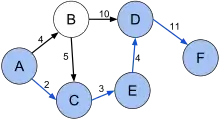 أقصر طريق (A, C, E, D, F) بين رأسي A و F في هذا المخطط ذو الأوزان.