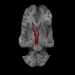 ![]() المسار السوداوي المخططي ظاهر هنا بأزرق متوسط الغمق، ويربط بين المادة السوداء والجسم المخطط المسار السوداوي المخططي ظاهر هنا بأزرق متوسط الغمق، ويربط بين المادة السوداء والجسم المخطط | |