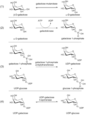 - أخيرًا ، يقوم UDP-galactose 4-epimerase بإعادة تدوير UDP-galactose إلى UDP-glucose لتفاعل transferase. بالإضافة إلى ذلك، فسفوغلوكوموتاز يحول D-الجلوكوز 1-فوسفات إلى D -glucose 6 فوسفات . [2] [3]